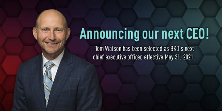 NATIONAL OFFICE – BKD CPAs & Advisors has selected Tom Watson as its next CEO, effective June 1, 2021. Watson will succeed current CEO Ted Dickman, who is retiring May 31, 2021. Watson’s selection is the culmination of a six-month selection process that was implemented by the firm’s Governing Board. “It is truly an honor to be asked to serve as BKD’s next CEO,” Watson said. “Our firm is blessed with a strong group of leaders that I am excited to work with to build on our outstanding legacy and guide us to even greater levels of success.” Watson’s previous experience as regional managing partner (RMP) for BKD’s South Region and managing partner for BKD’s Dallas/Fort Worth/Waco practice helped him gain the expertise needed for this new role. Prior to becoming a managing partner, Watson played a significant part in growing BKD’s Texas health care practice into one of the most formidable groups in the profession. “We believe Tom will continue to propel BKD forward and has a high ceiling for what he is capable of doing as a leader. He understands where the profession is heading as the world evolves, and he embraces the digital transformation we’re already experiencing,” said Dickman. “Our profession is at the start of a technological evolution, and that will certainly influence our vision and strategy over the next decade,” Watson said. “I am very bullish about BKD’s future and the opportunities this transformation creates for us to help our clients solve their complex problems while creating rewarding careers for our professionals.” Dickman will continue handling all CEO responsibilities while involving Watson in key decisions through the end of 2020. This will allow Watson some time to further develop his strategic plans and meet with our various leaders across the firm before taking on full CEO responsibilities. In early 2021, Watson will take on more of a leading role, and Dickman will spend more time on some special projects before retirement.
