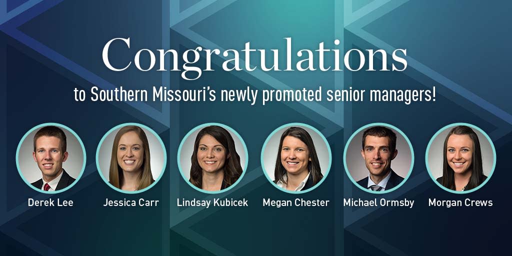 Congratulations to BKD's Southern Missouri Office's newly promoted Senior Managers - Derek Lee, Jessica Carr, Lindsay Kubicek, Megan Chester, Michael Ormsby, and Morgan Crews!