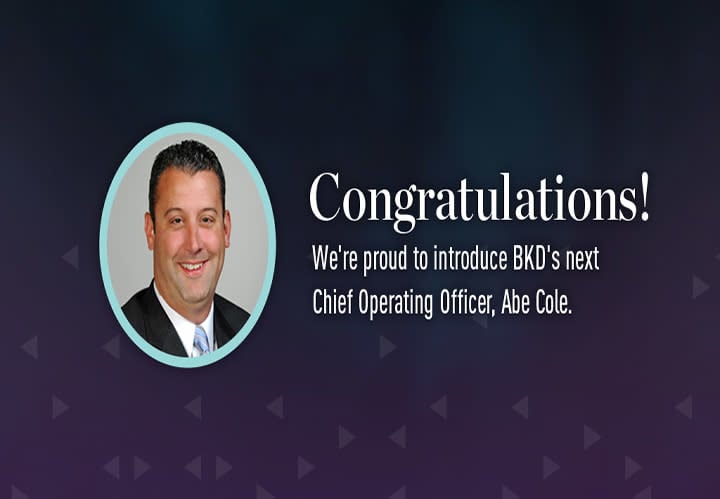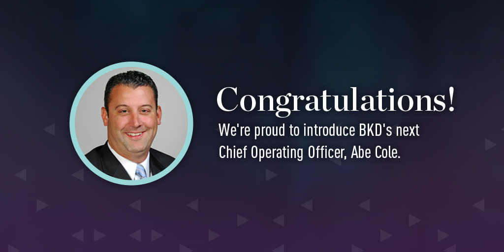 "The COO plays a critical role in BKD’s success, with the responsibility of promoting firmwide operational excellence, which is one of the hallmarks that set BKD apart,” said CEO-elect Tom Watson. “Abe’s skill set is perfectly suited to keep us on top of our game when it comes to taking care of our business."