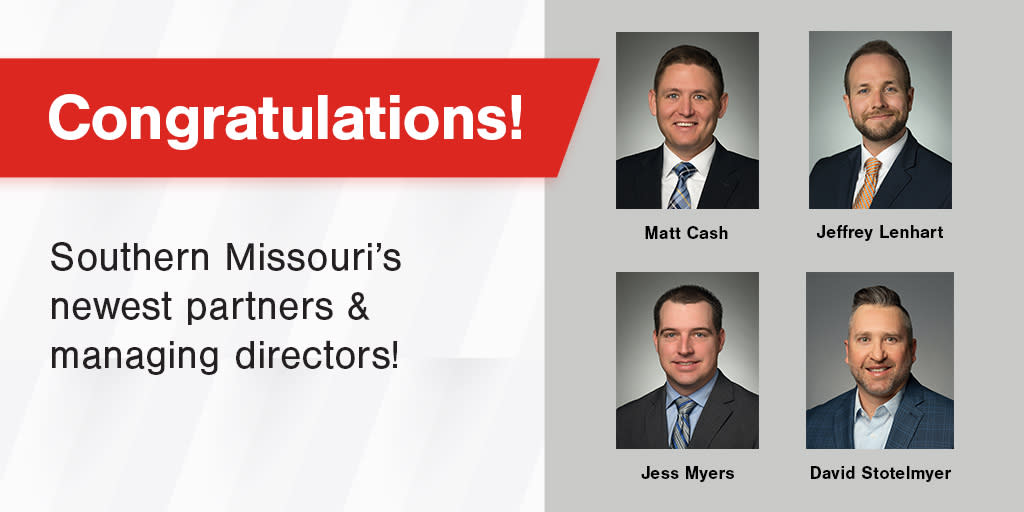 Congratulations to FORVIS' Southern Missouri Office's newest Partners and Managing Directors - Matt Cash, Jeffrey Lenhart, Jess Myers, and David Stotelmyer!