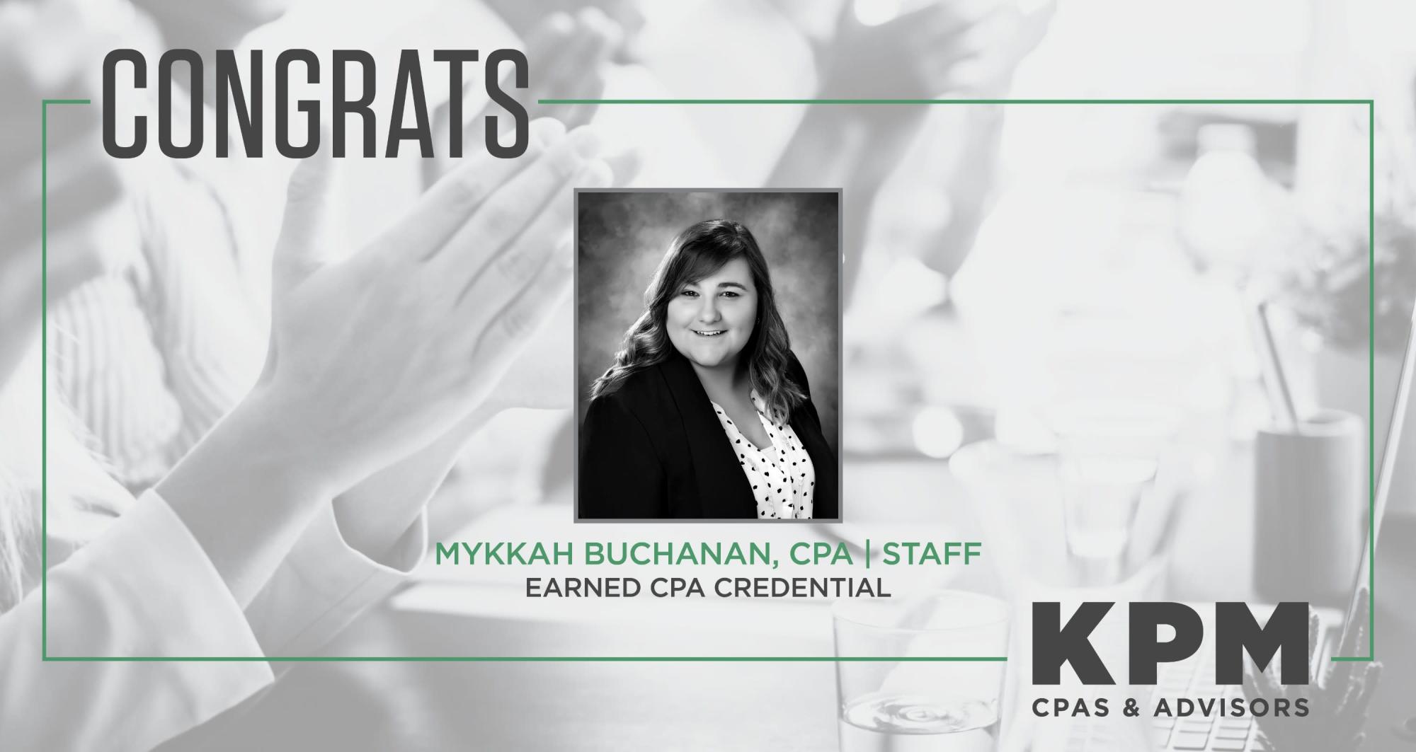 Springfield, MO – KPM CPAs & Advisors (KPM) is pleased to announce Mykkah K. Buchanan, a staff accountant with the firm, has recently completed all parts of the certified public accounting (CPA) examination and earned her CPA license. The CPA designation, awarded by the American Institute of CPAs, signifies that the education, examination, and experience requirements for licensure have been met.