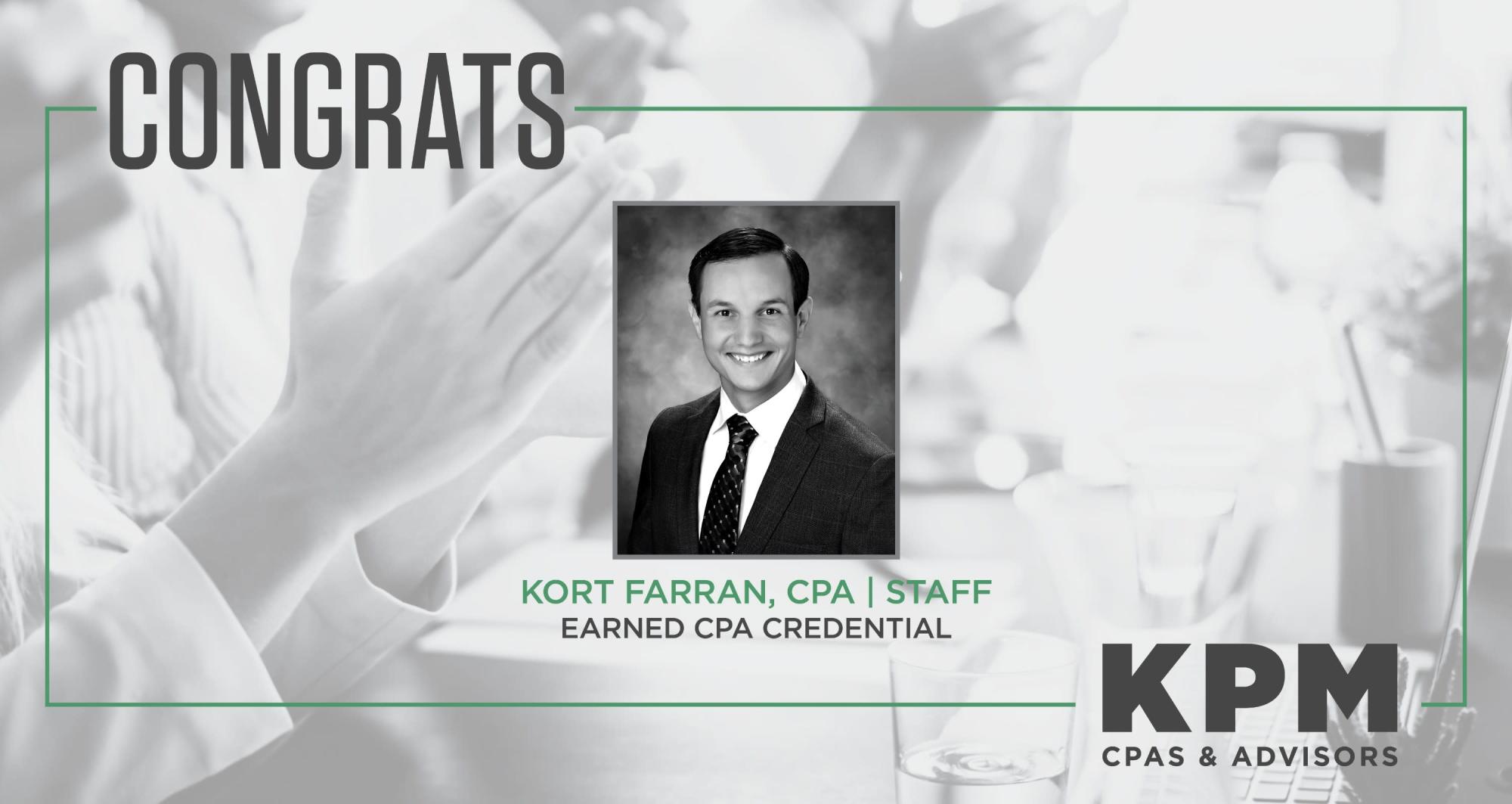 Springfield, MO – KPM CPAs & Advisors (KPM) is pleased to announce that Kort N. Farran, a staff accountant with the firm, has recently completed all parts of the certified public accounting (CPA) examination and earned his CPA license. The CPA designation, awarded by the American Institute of CPAs, signifies that the education, examination, and experience requirements for licensure have been met.
