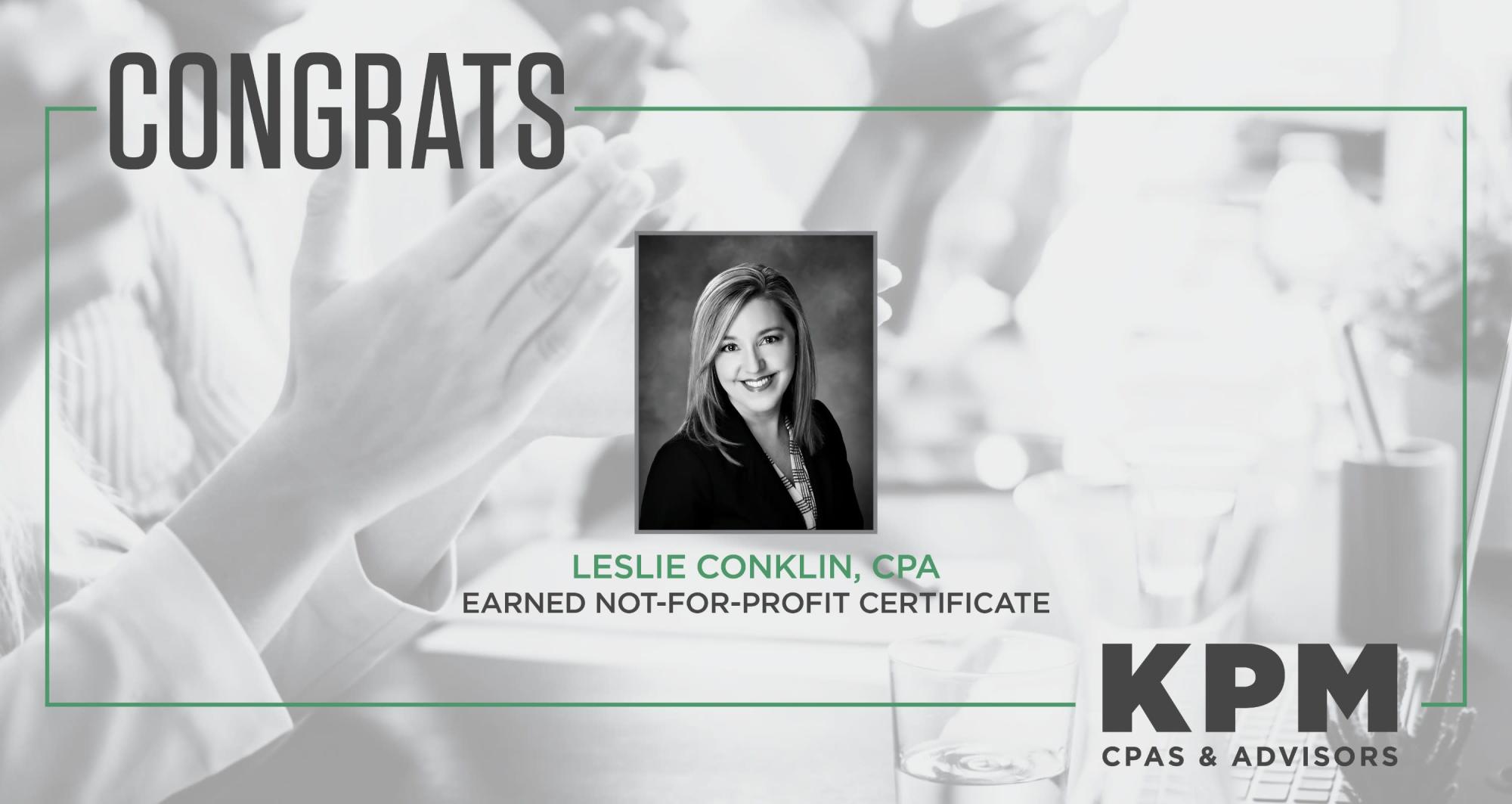 Springfield, MO – KPM CPAs & Advisors (KPM) is pleased to announce that Leslie Conklin, CPA and Supervisor on the firm’s audit team, has earned the Not-for-Profit Certificate from the American Institute of CPAs (AICPA). Leslie serves a variety of non-profit clients and completing this program signifies an advanced understanding of not-for-profit financial management, including accounting and financial reporting, tax compliance, and governance and assurance.