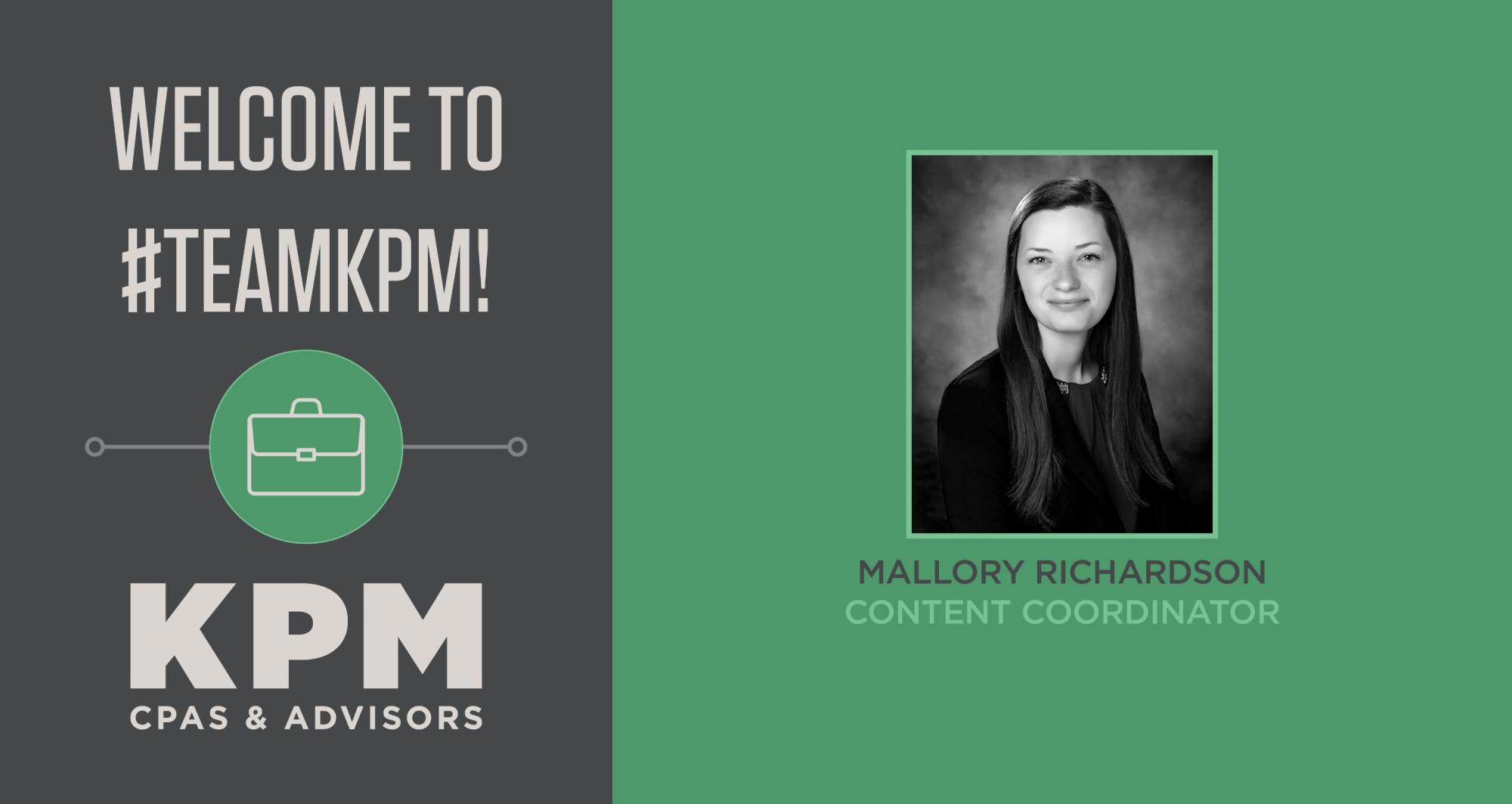 Mallory K. Richardson has been hired as a content coordinator with the firm and assists with the daily operations and administrative functions of the audit department, including report editing and processing. She graduated from Missouri State University (MSU) with her B.S. degree in Professional Writing, M.A. degree in Technical & Professional Writing, and A.A. degree in General Studies from MSU-West Plains. Mallory has been with KPM for nearly a year and previously served as a technical writing intern.