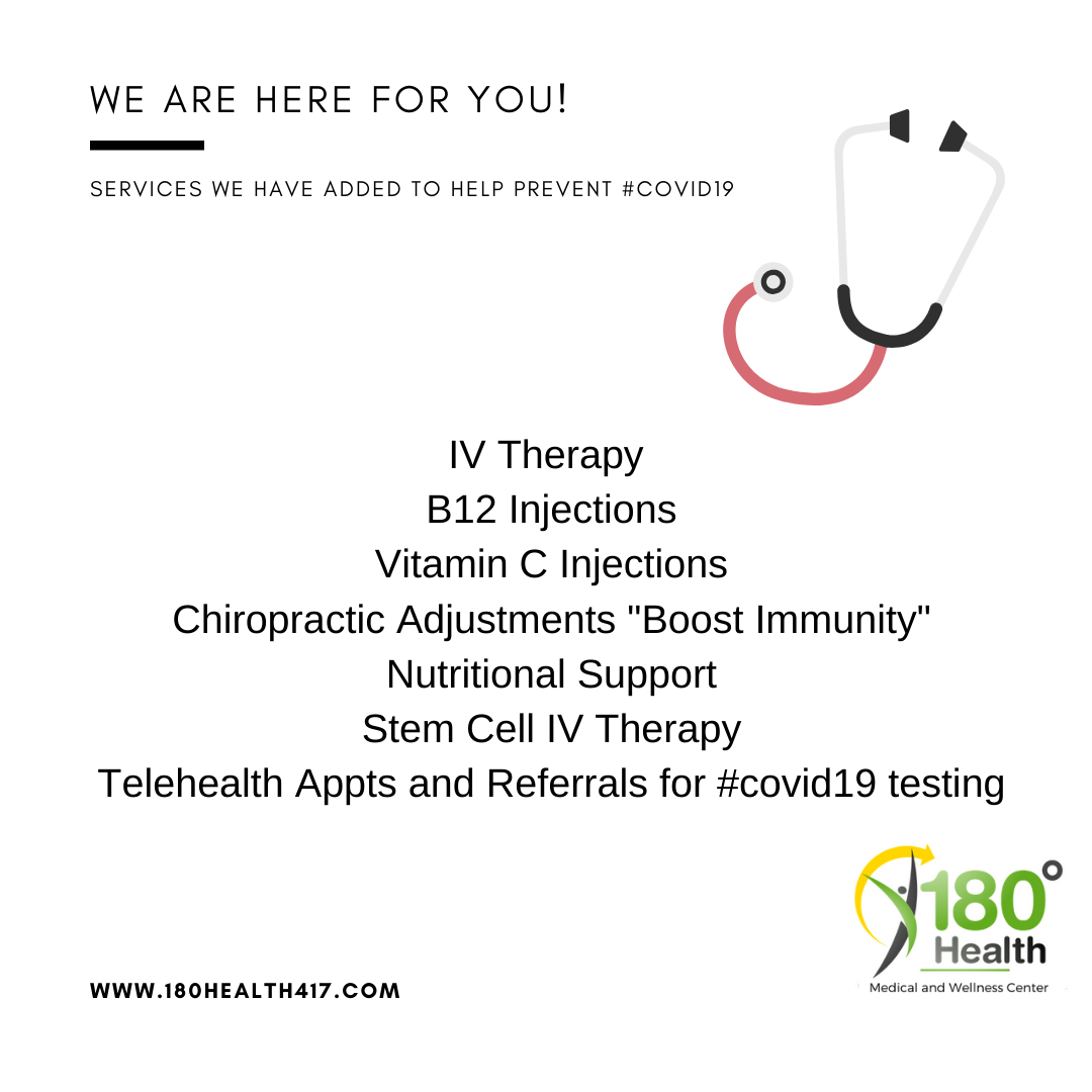 Springfield, MO— 03/26/2020 — Today Meek Chiropractic and 180 Health announce the addition of services that improve overall immunity in the wake of Covid19. Our offices are in prevention mode to support our patients and healthcare workers in the area. “Our job has always been prevention” and we feel this is the time for us to step up and truly help our community in this time of need.