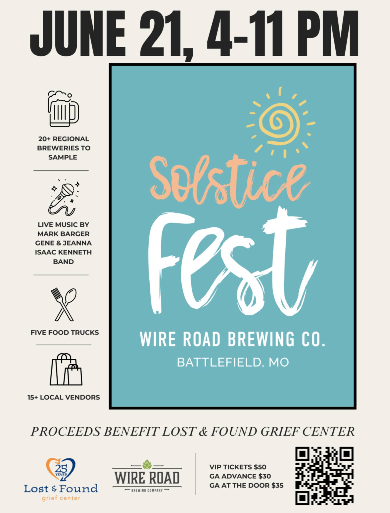“Solstice Fest is a celebration of summer in the Ozarks with great food, drinks, and entertainment,” said Kary Walker, Wire Road co-owner. “While we are all about enjoying life, we know that a tragic loss can devastate a family—that's why we are proud to support Lost & Found Grief Center and its important work.”